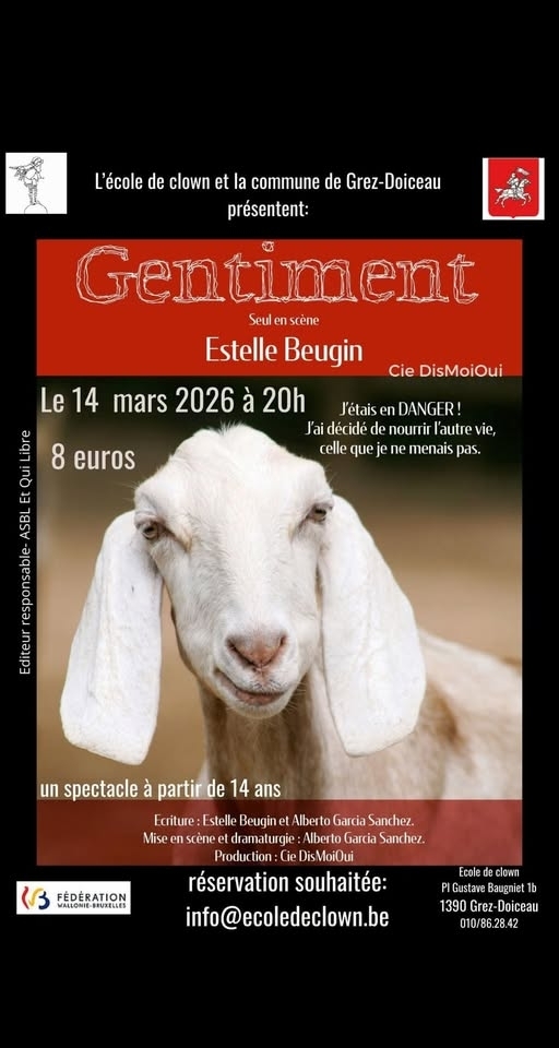 Très beau spectacle sur la gentillesse le samedi 14 mars à 20h à l'école de clown"Un spectacle de théâtre en solo qui explore avec finesse l'hypocrisie du monde à travers le prisme de l'implacable gentillesse" -