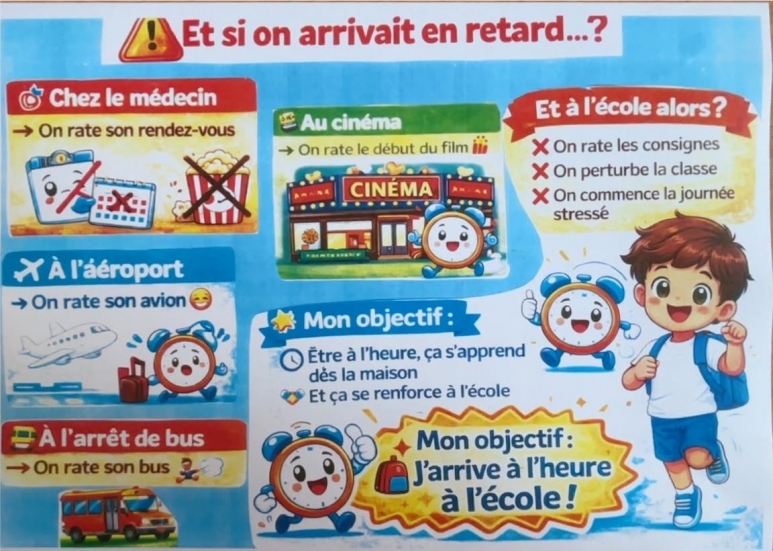 Arriver à l'heure à l'école est très important pour réussir !Cela permet de ne pas manquer le début des cours, moment où les consignes sont données.Etre ponctuel montre aussi du respect envers les enseignants et les autres élèves.De plus, cela aide à rester organisé et à bien commencer la journée sans stress.En prenant l'habitude d'arriver à l'heure, on développe un sens des responsabilités utile pour toute la vie -