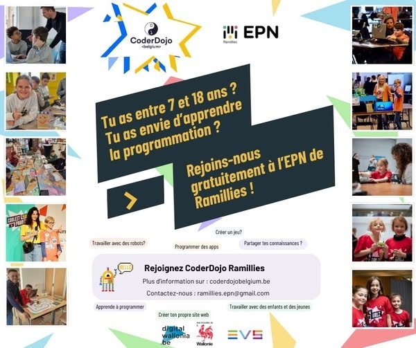 Le Club CoderDojo de Ramillies a ouvert ses portes à l’EPN de Ramillies !Tu as entre 7 et 18 ans et tu rêves de découvrir le monde de la programmation informatique, de la robotique et de l’électroniqueLes noms Scratch, Arduino, mBot, Micro:bit te parlent déjà ? Tu es simplement curieux d'en savoir plus ?Rejoins-nous au CoderDojo de Ramillies le samedi 18 avril de 14h00 à 16h00 !Dans une ambiance conviviale et ludique, tu apprendras les bases du code, tu construiras et tu programmeras des robots, et tu exploreras l’électronique avec l’aide de super coachs bénévoles.N'hésitez pas à vous inscrire https://www.eventbrite.com/e/1983967628584?aff=oddtdtcreatorToutes nos activités sont 100 % gratuites. Viens nous rencontrer à l’Espace Public Numérique (EPN) de Ramillies.Plus d'infos : rue du Wayaux, 4 ou ramillies.epn@gmail.com -