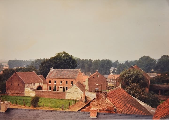 Parmi les éléments les plus impressionnants de la ferme Ramaekers se distinguait une grange monumentale, située à droite du panorama évoqué. Derrière un arbre, elle se dressait comme un repère architectural majeur du site.