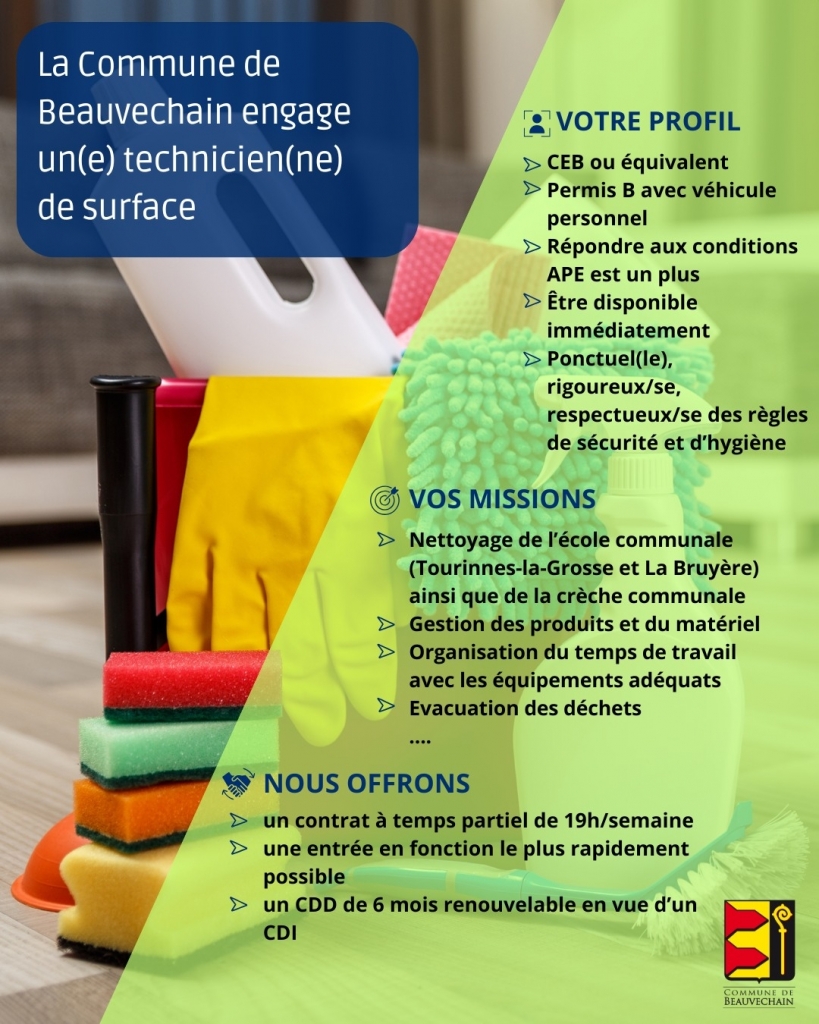 La commune de Beauvechain recrute un(e) technicien(ne) de surfacePour les écoles communales et la crèche communale de Beauvechain.Envoyez votre candidature avant le 15 décembre 2025 !Votre dossier doit contenir :• Lettre de motivation• CV détaillé• Copie du/des diplôme(s) requis (+ reconnaissance si diplôme étranger)• Copie du permis B• Preuve d’inscription comme demandeur d’emploi (si APE)Envoyez-nous tout ceci :• Par mail : grh@beauvechain.be ou personnel@beauvechain.be• Ou par courrier : Collège communal, Place communale 3, 1320 BeauvechainÉpreuve orale : semaine du 15 au 19 décembre 2025Toute candidature incomplète ou hors délai sera rejetée.Infos : 010/86 83 11grh@beauvechain.be | personnel@beauvechain.be -