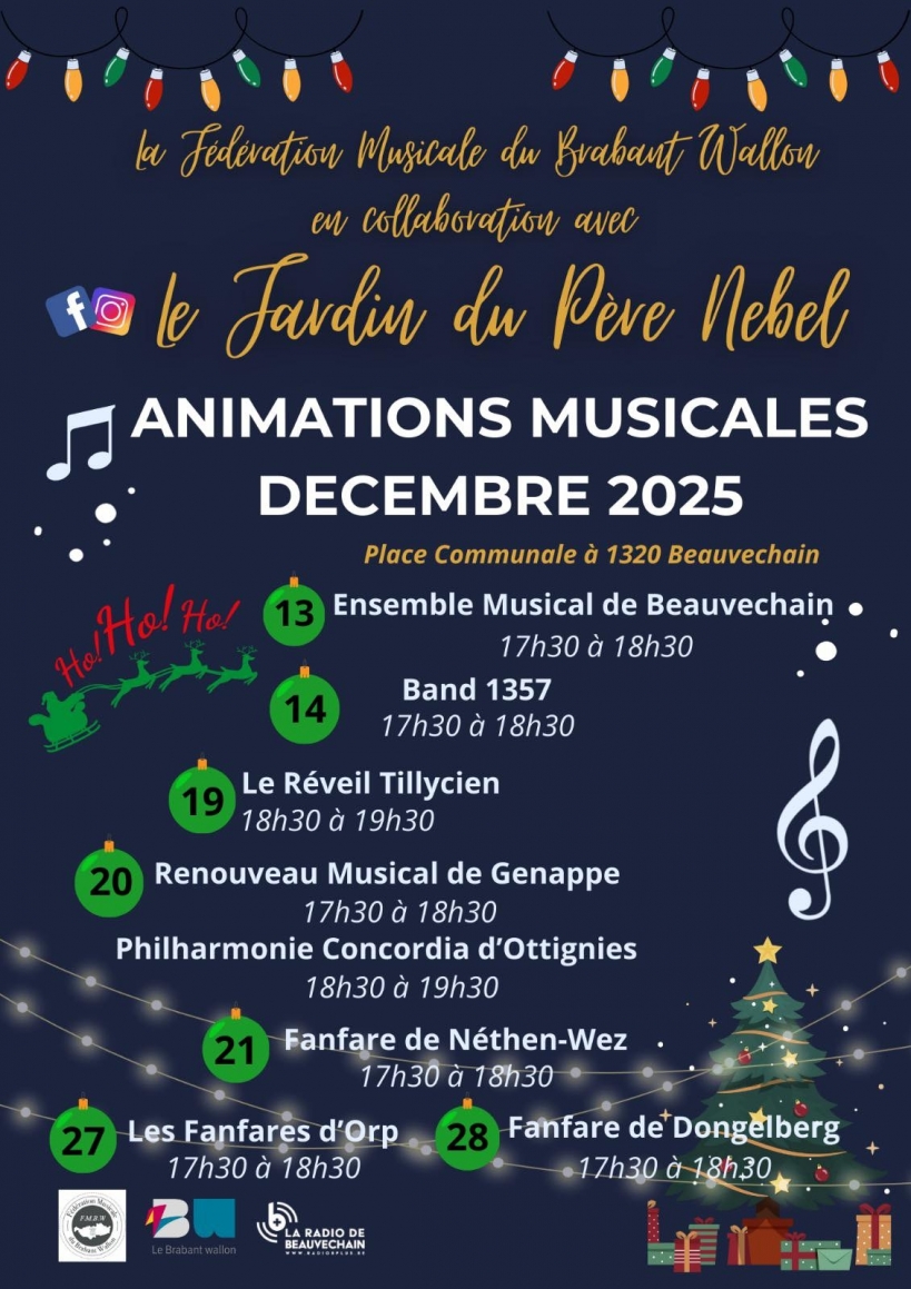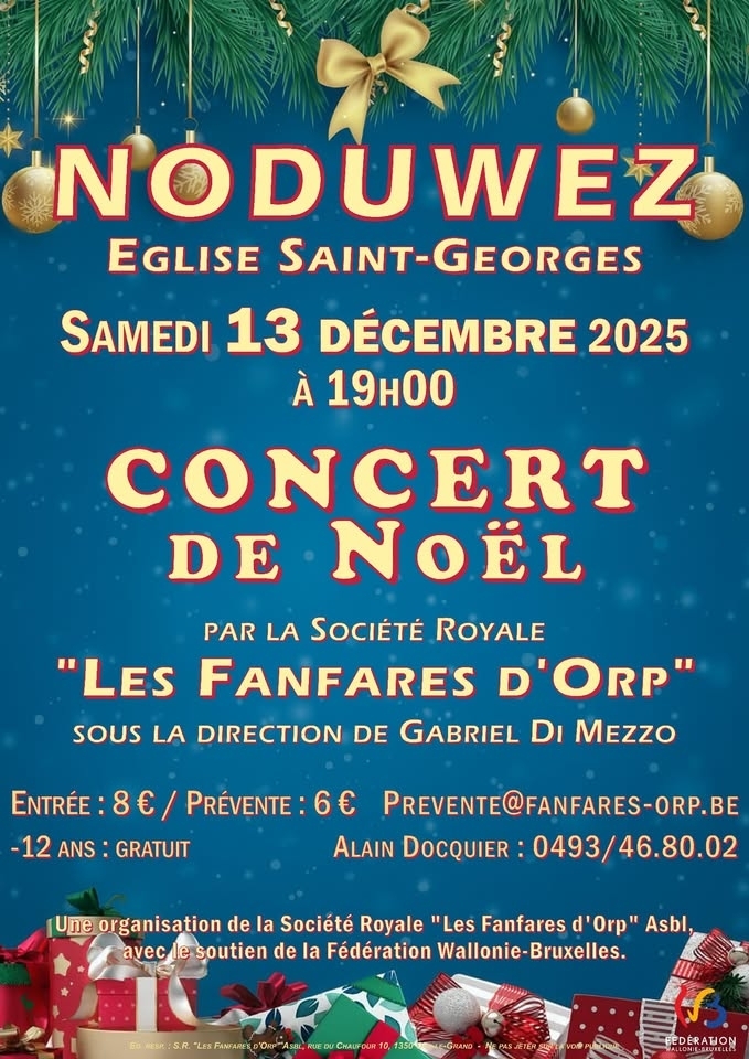 La Société Royale Les Fanfares d’Orp, sous la direction de Gabriel Di Mezzo, vous invite à plonger dans la magie de Noël avec un concert plein d’émotion et de chaleur musicaleEn l' Église Saint-Georges – NODUWEZ le Samedi 13 décembre 2025 à 19h00Entrée : 8 € - Prévente : 6 €
