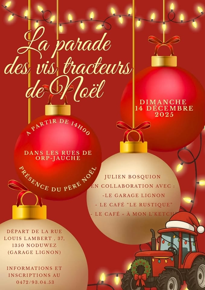 Départ du cortège à 14h.Itinéraire & Arrêts Gourmands- 1er arrêt : Home Malevé à Maret : Vin chaud bien épicé. Soupe à l’oignon réconfortante, Bière de Noël.- 2ème arrêt : Café Le Rustique-Jauche. Un bon verre dans une ambiance conviviale.Arrivée : Café À mon L’Ketch – Folx-les-Caves. Délicieuse tartiflette maison Vin chaud. bière de Noël. soupe… le tout dans la bonne humeur !Ambiance chaleureuse – Lumières – ConvivialitéInfos & inscriptions obligatoire pour les chauffeurs: 0472/93 04 53