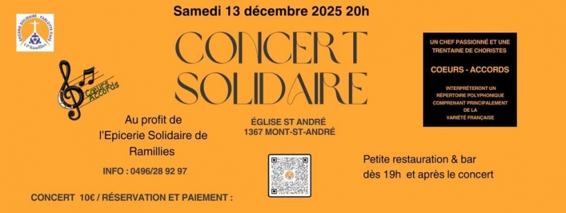 Entrée : 10 € (au profit de l’Épicerie Solidaire de Ramillies)Avant et après le concert, profitez d’un bar et d’une petite restauration dans une ambiance conviviale.Le groupe Cœurs-Accords, composé d’une trentaine de choristes et dirigé par un chef de chœur passionné, nous offrira gracieusement un répertoire polyphonique mêlant chansons chorales et variété française. Une soirée placée sous le signe de la musique, de la chaleur humaine et de la solidarité.Tous les bénéfices de la soirée seront reversés au profit de l’Épicerie Solidaire de Ramillies.Venez nombreux partager ce moment festif et soutenir une belle cause locale !Votre paiement vaut réservation sur : le compte de Christine Strauven – BE63 1431 3191 0708 -Communication : nom + concert + nombre de personnesInfos : 0496/28 92 97 -