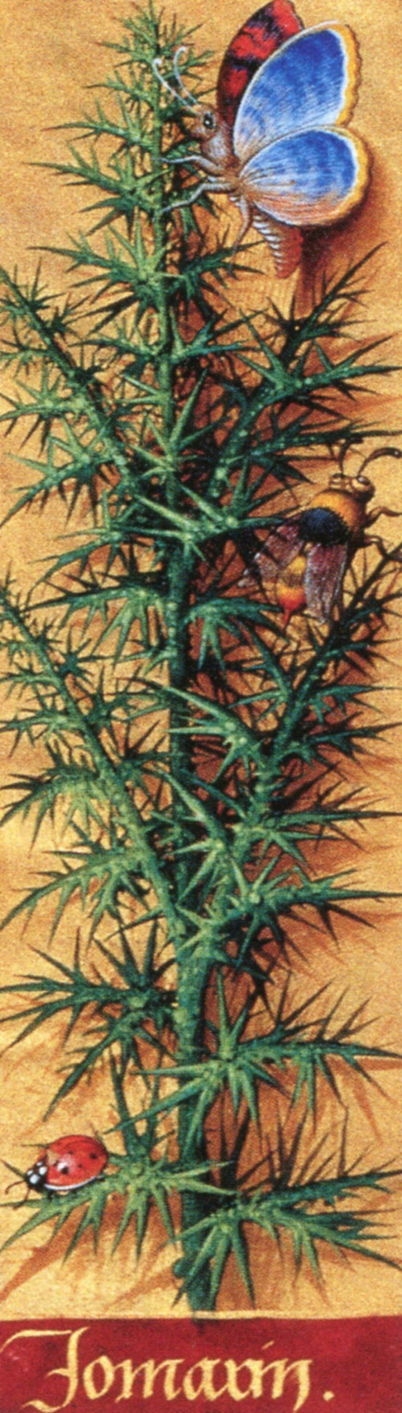 Image : l'Ajonc (jonc marin), nommé ici "jomarin", mais qui, malgré son nom n'a pas besoin de la mer pour croître. Jean Bourdichon, jonc marin, Horae at usum romanum dites Grandes Heures d'Anne de Bretagne, 1503-1508.