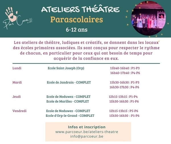 Nos ateliers parascolaires du lundi à l’@Ecole Saint Joseph Orp-le-Grand ouvrent encore leurs portes aux jeunes comédiens curieux de découvrir le théâtre !