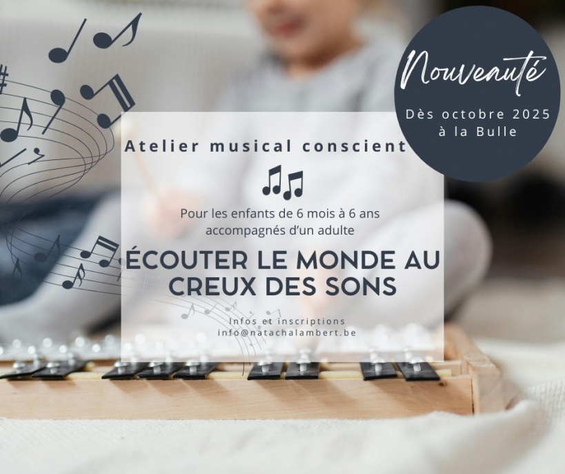 C’est un moment de découverte et de complicité, où chacun – parent comme bébé – se laisse surprendre par la magie des sons. Je propose ce temps d’éveil le samedi 4 octobre de 9h30 à 10h30 à La Bulle, maison de naissance à Feluy. À partir de 6 mois (idéalement bébé doit pouvoir tenir assis - mais si tu veux partager ce moment avec ton bébé plus jeune, tu es le/la bienvenue).
