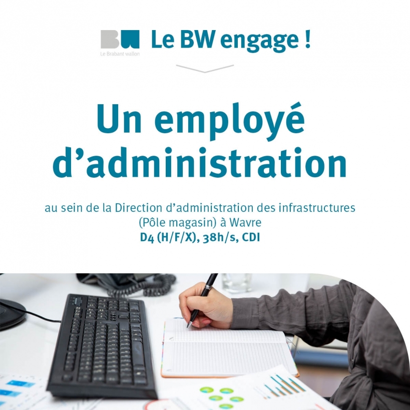 Le Brabant wallon recherche un employé d'administration, D4 (H/F/X), au sein de la Direction d’administration des infrastructures (Pôle magasin) à Wavre, en CDI 38h/s !