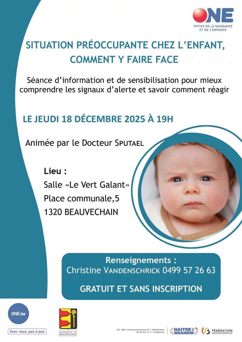L’ONE et la Commune de Beauvechain vous invitent à une séance d’information pour mieux comprendre les signaux d’alerte chez les jeunes enfants et savoir comment réagir face aux situations courantes :