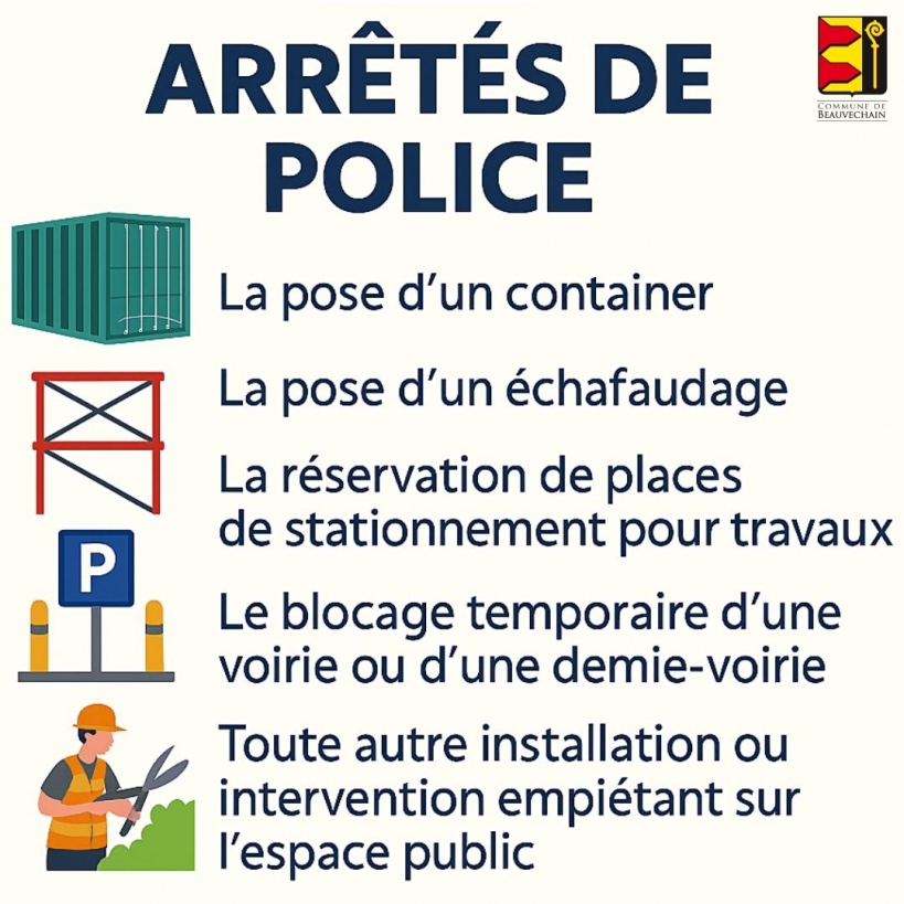 Nous rappelons à l’ensemble des citoyens, entrepreneurs et sociétés que toute occupation de la voie publique doit faire l’objet d’une demande préalable d’arrêté de police via le formulaire à retrouver sur le site de la commune : https://www.beauvechain.eu/.../gardien-de-la-paix/demarches, à introduire au minimum 15 jours ouvrables avant le début de l’occupation à l’adresse gardienpaix@beauvechain.be
