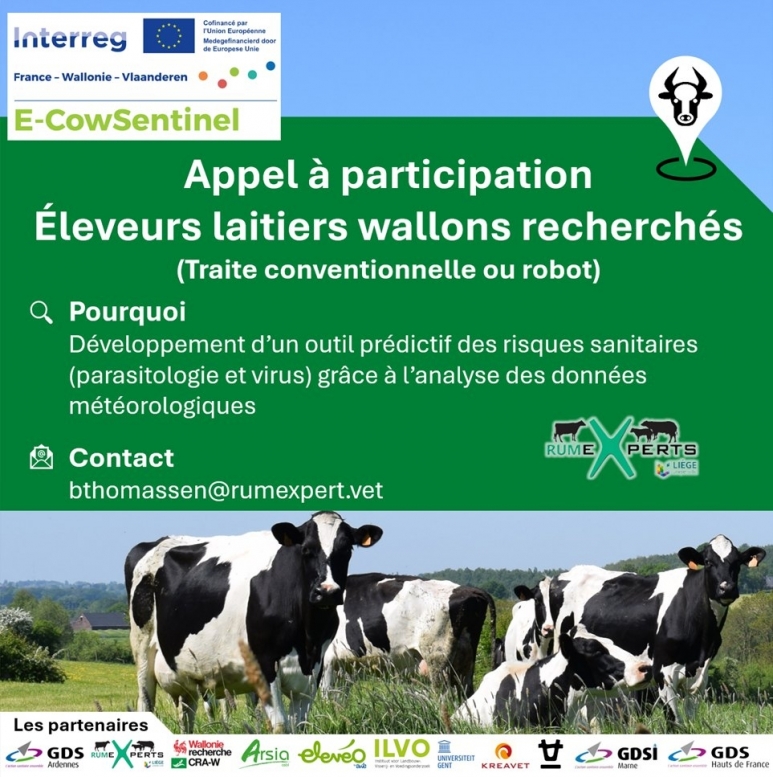 Dans le cadre du projet E-CowSentinel (Interreg Wallonie-Flandres-France), RumeXperts recherche des fermes laitières (traite conventionnelle ou robotisée) souhaitant participer à une étude innovante.