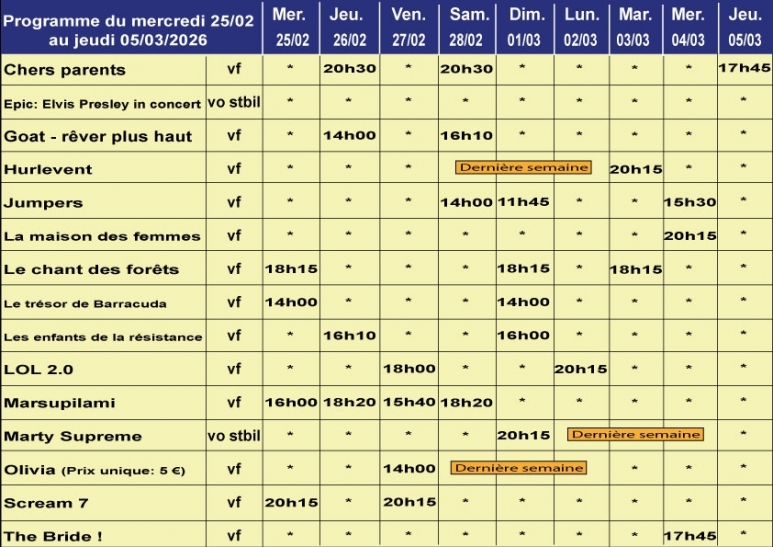 Les programmes ne sont pas connus à l’avance; ceux-ci sont mis à jour tous les lundis, cela ne sert donc à rien de nous envoyer un mail nous demandant les programmes plus loin dans le temps; nous ne pourrons pas vous aider !