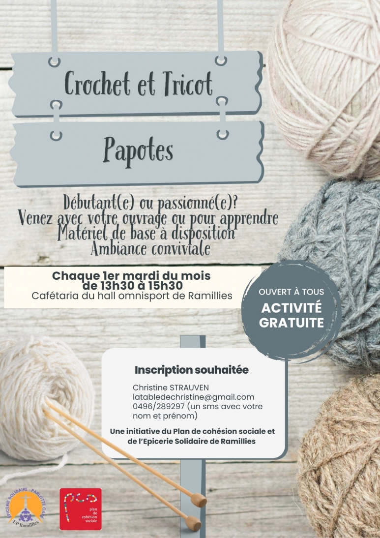 Un RDV crochet et tricot chaque 1er mardi du mois de 13h30 à 15h30 à la cafétaria du hall Omnisports de Ramillies.