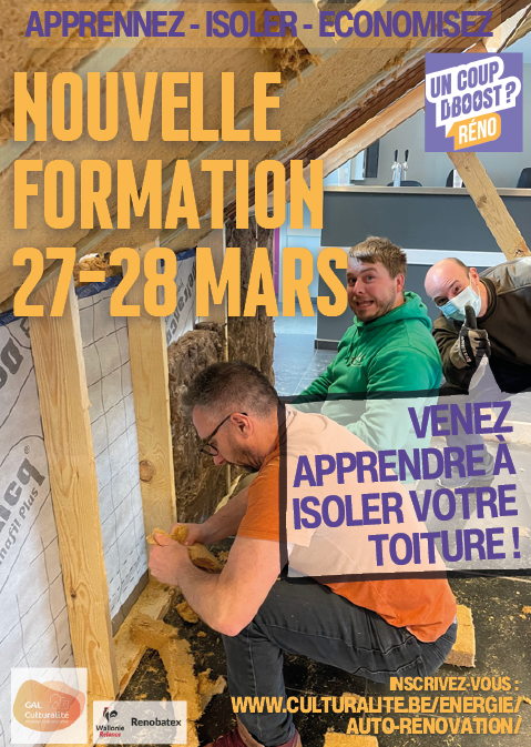 Les 27 et 28 mars 2026, le projet Coup d’Boost RENO, porté par le GAL Culturalité, soutenu par la Commune de Hélécine et la Région wallonne, revient pour accompagner les propriétaires qui souhaitent isoler leur toiture eux-mêmes, tout en bénéficiant d’un encadrement professionnel.Pas besoin d’être bricoleur ou expert !