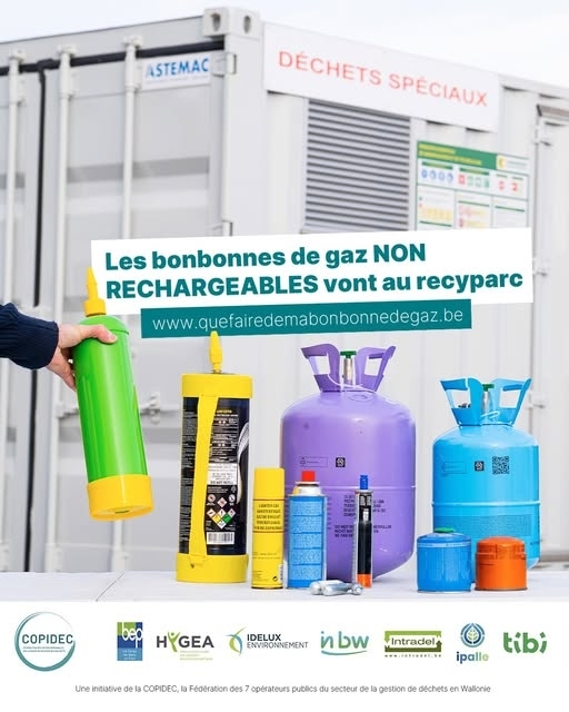 Déposez vos bonbonnes non rechargeables dans la catégorie « déchets spéciaux des ménages » au recyparc. C'est le moyen le plus sûr de les éliminer correctement.