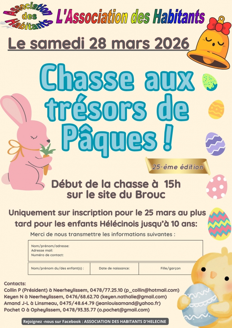 L'Association des Habitants d'Hélécine organise "La Chasse aux trésors de Pâques" ce samedi 28 mars 2026 à 15h pour les enfants d'Hélécine de 0 à 10 ans