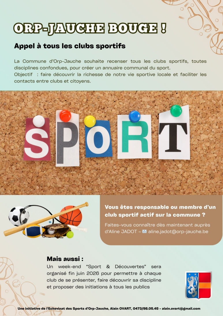 La Commune d’Orp-Jauche relance son appel à tous les clubs sportifs actifs sur le territoire, toutes disciplines confondues.