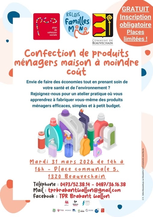 Rejoignez le relais familles mono pour un atelier pratique où vous apprendrez à fabriquer vous-même des produits ménagers efficaces, simples… et à tout petit budget !