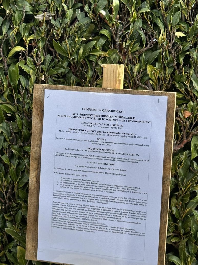 Cette réunion d’information : se tiendra le mardi 31 mars 2026 à 20h à la Maison rurale – Chaussée de Jodoigne 4, Grez-Doiceau
