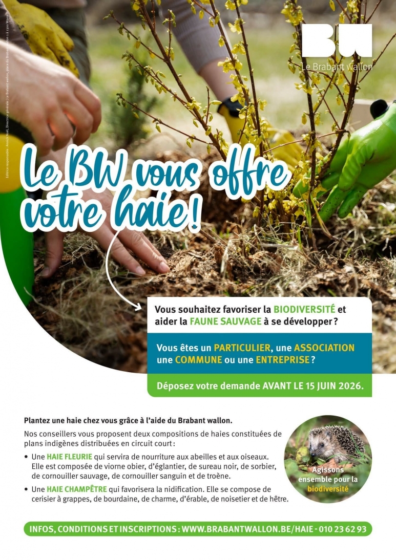 Vous êtes un particulier, une association, une entreprise ou une commune? Vous souhaitez favoriser la biodiversité? Plantez une haie fleurie ou champêtre grâce à l'aide du Brabant wallon. La distribution des plants aura lieu le 21 novembre 2026.