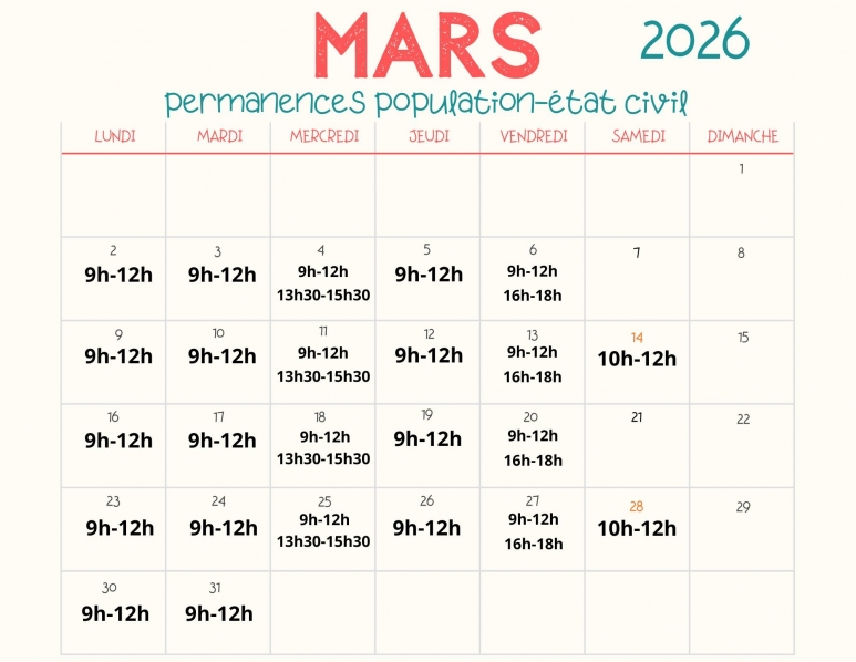 Ce mois de mars, vous avez besoin d'un document ou d'une démarche à l'administration communale ? Avant de vous déplacer, pensez à consulter notre agenda pour savoir quand nos équipes sont disponibles pour vous aider !