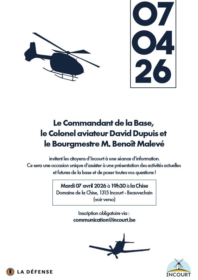Le Commandant de la base aérienne de Beauvechain, le colonel aviateur David Dupuis et le Bourgmestre d'Incourt, M. Benoit Malevé, invitent les habitants de la commune d'Incourt à une séance d’information sur les activités de la base aérienne de Beauvechain.