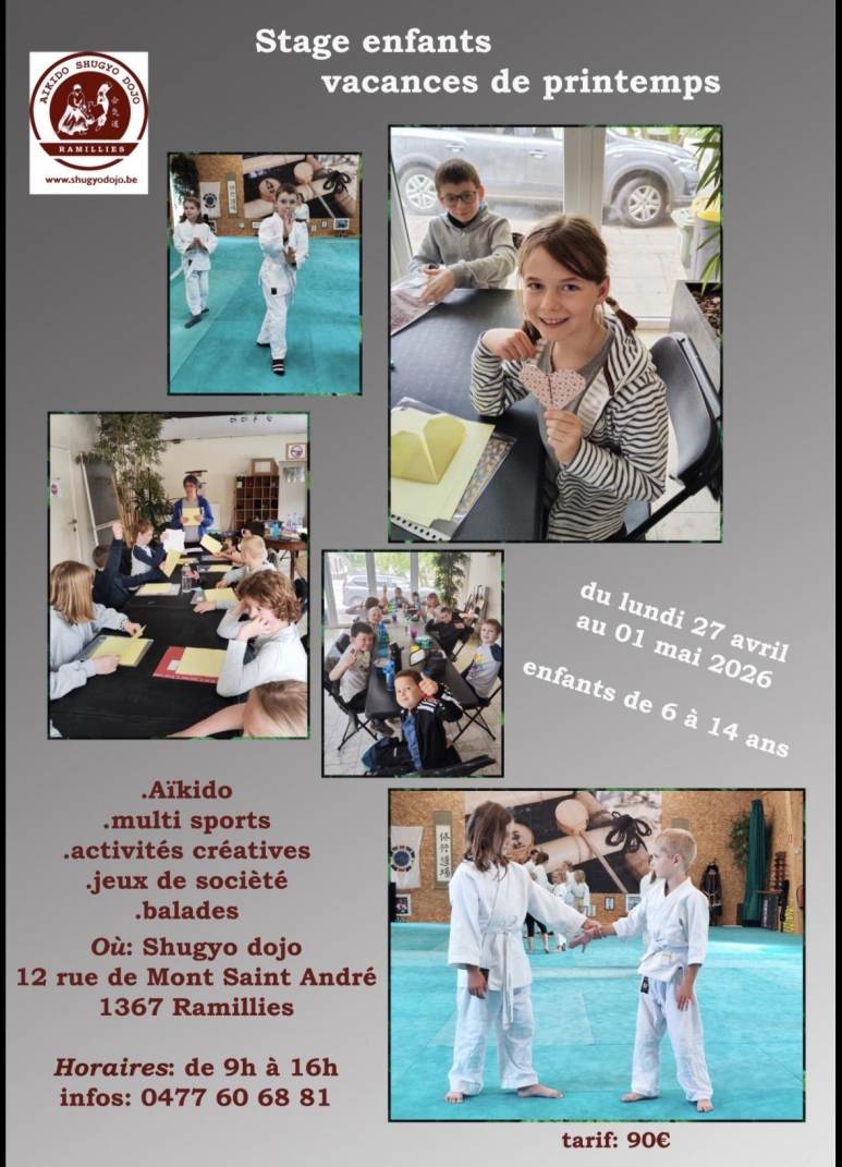 Le Shugyo Dojo de Ramillies organise un stage durant les vacances de Printemps du 27 avril au 01 mai 2026 pour les enfants de 6 à 14 ans. Ouvert à tous.