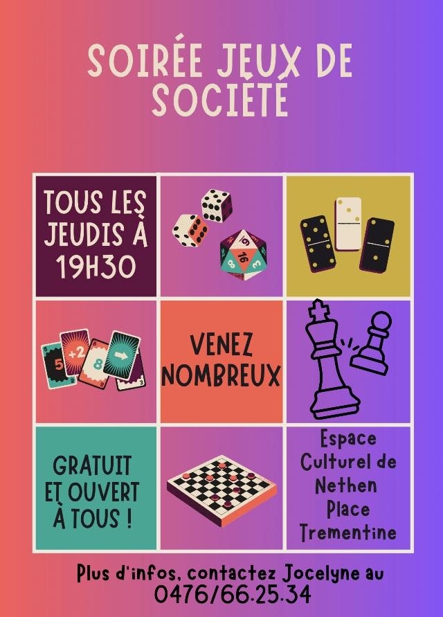 Hello à tous, soirée jeux ce jeudi à la salle de Nethen dès 19h30
