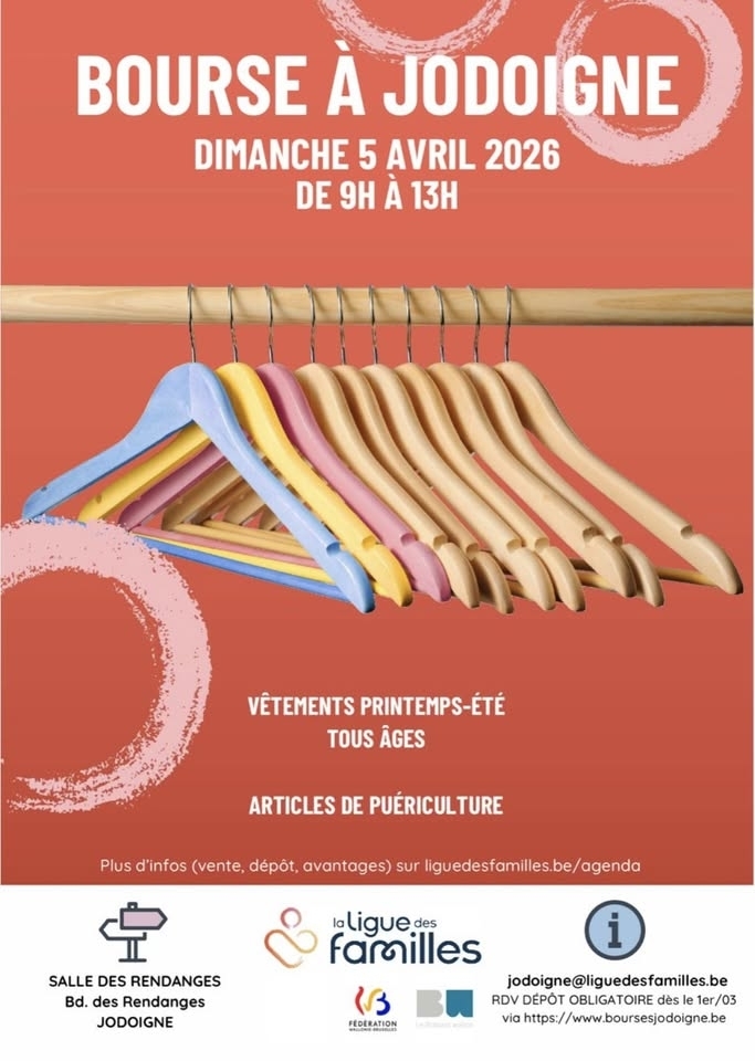 Le dimanche 5 avril de 9 à 13 h en la salle des Rendanges, grande bourse aux vêtements mise sur pied par la Ligue des Familles de Jodogne.