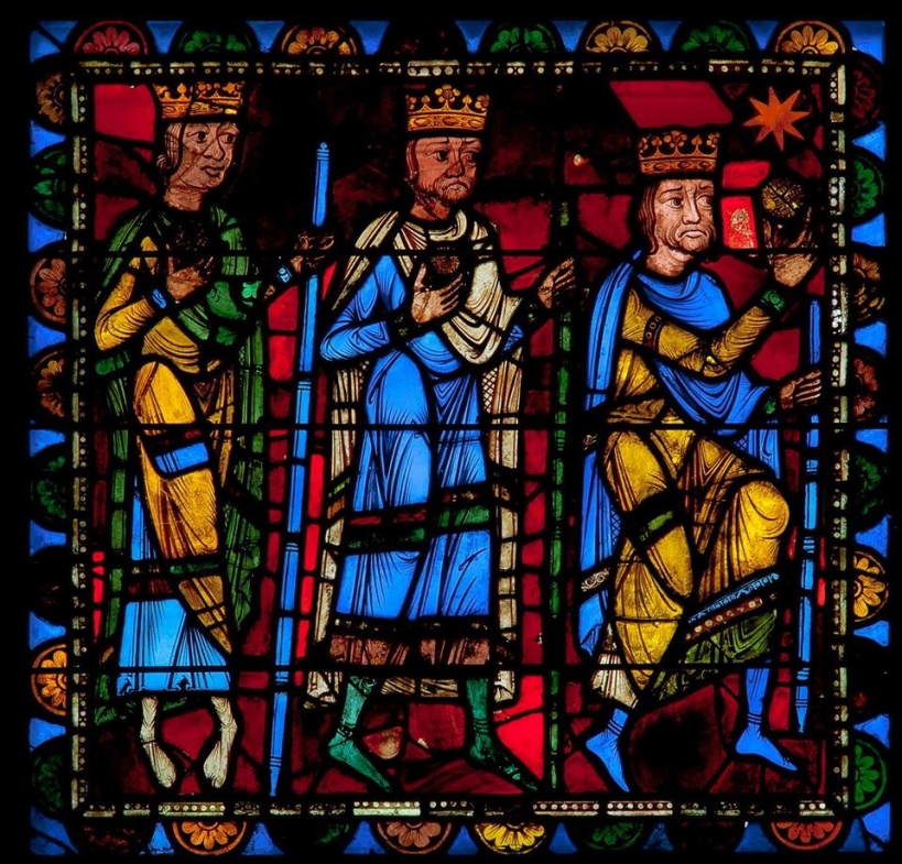 Or, sur la verrière centrale de la cathédrale de Chartres, l'Enfance et la Vie du Christ, chacun des Mages apporte une pièce d'or. Pour comprendre cette représentation, il faut se référer alors à l'évangile apocryphe du Pseudo-Matthieu.