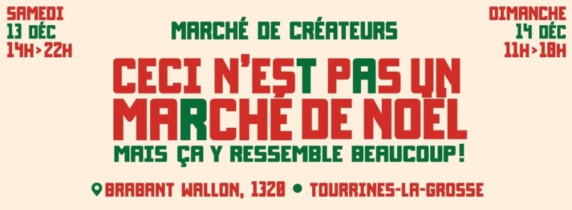 Envie d’un moment simple et chaleureux ? Vous aimez offrir des cadeaux de Noël qui sortent de l'ordinaire ?Plusieurs créateurs locaux seront présents pour vous présenter leurs univers : vêtements custom, vaisselle en céramique, carnets reliés, cartes postales originales, vitraux, bijoux, luminaires, photophores, sérigraphies, textile pour la maison…On organise un petit marché de Noël convivial avec des créateurs du coin, du vin chaud, des frites et une ambiance cosy comme on aime. Venez flâner, discuter, découvrir et surtout… nous dire bonjour !Ces samedi 13 décembre: de 14h à 22h et dimanche 14 décembre: de 11h à 18h Rue du culot 46, 1320 TOURINNES-LA-GROSSE -